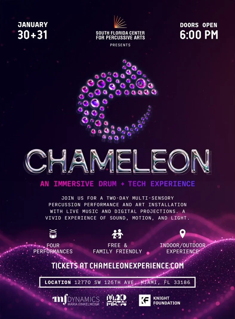 Each step in the process of creating this experience, from working with The South Florida Center for Percussive Arts leadership and students to building with my colleagues at MAD Arts and MF Dynamics, has unpacked a new lens on this narrative. There is a universal connection and understanding that no matter your story, your past, or your ambitions, we are all trying to express our deepest selves, no matter when or how we each “Chameleon.”