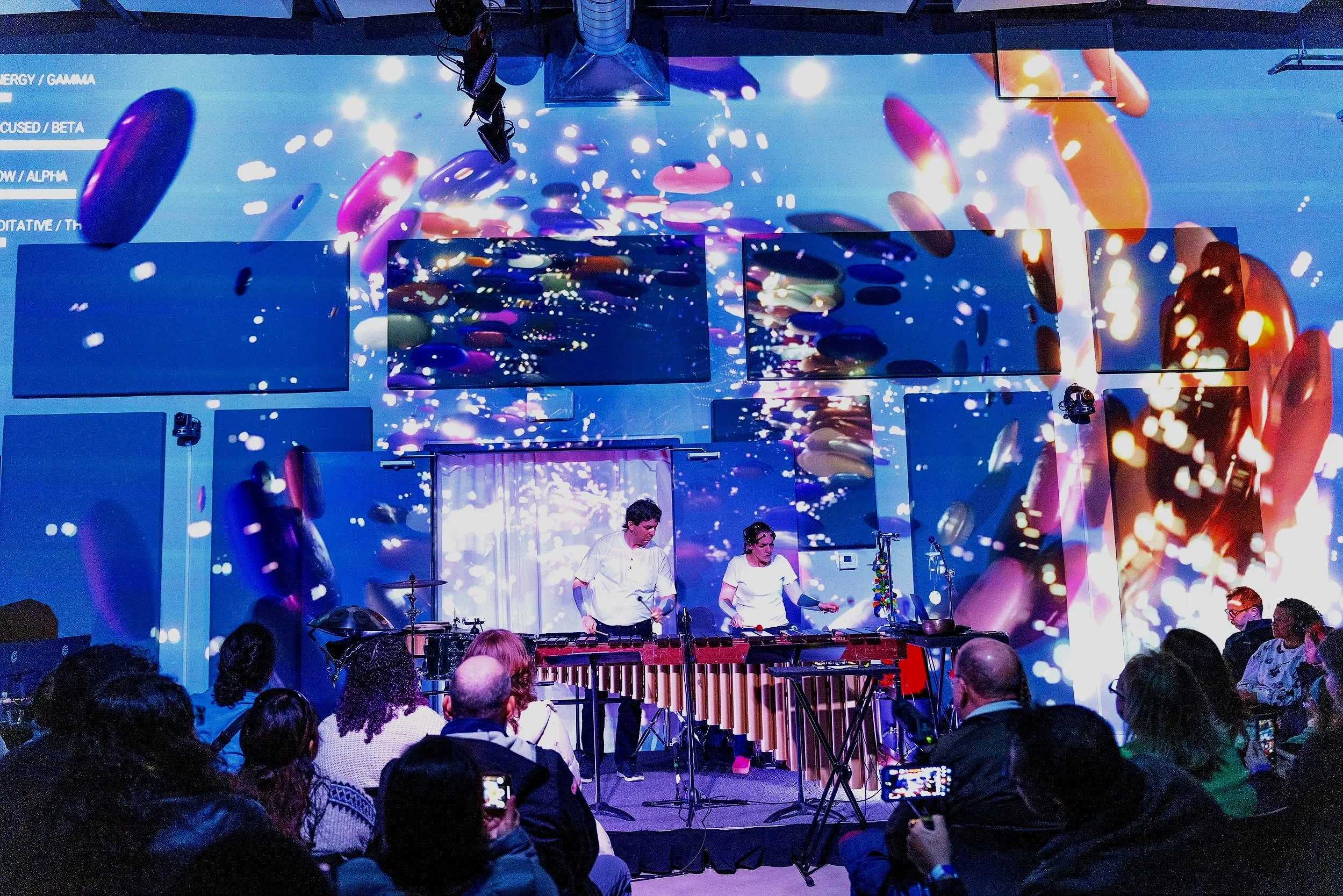 New technologies translated performers’ pulse, movement, and brainwave data into dynamic sound and imagery, revealing the living interplay between body, instrument, and space.