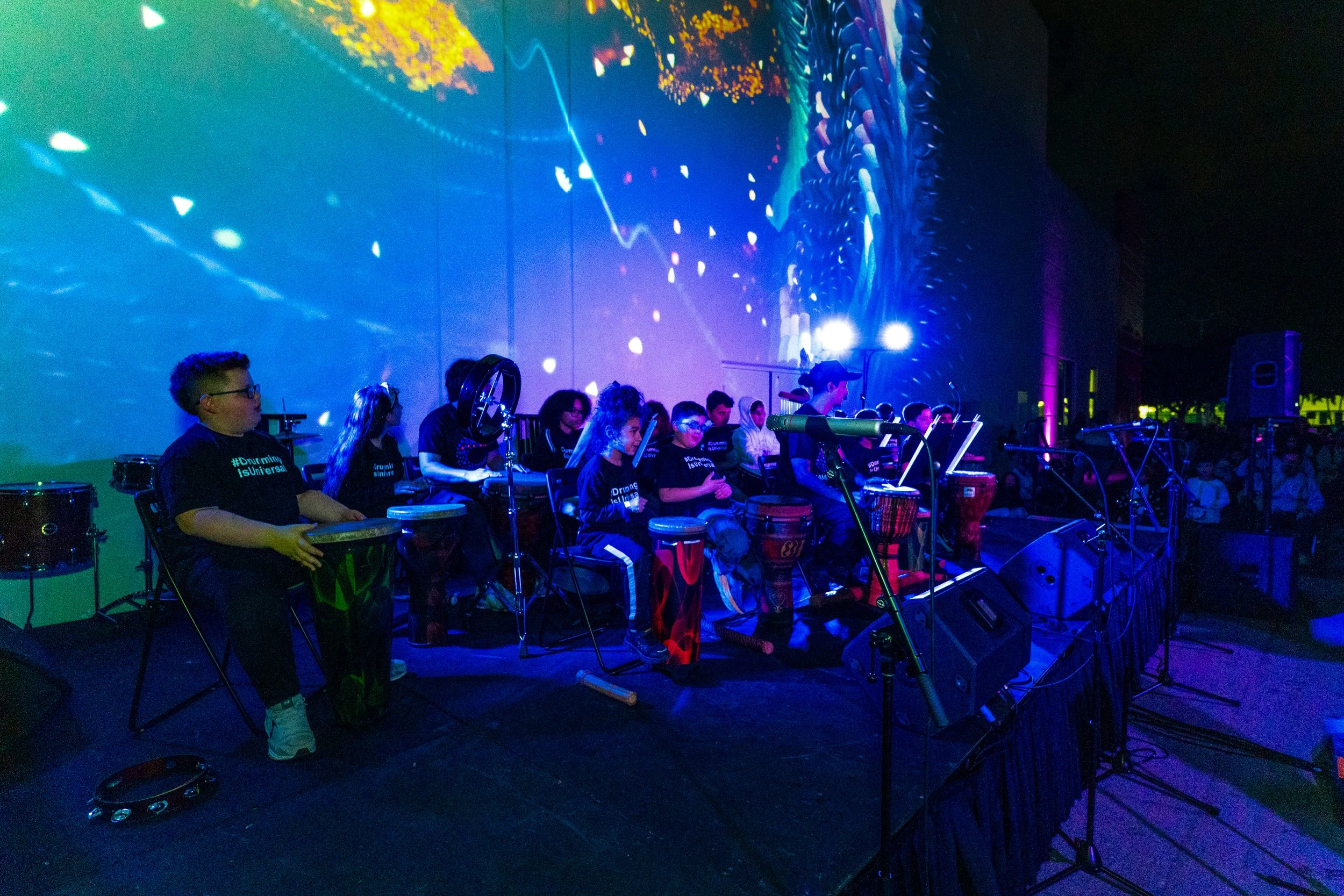 Each evening featured four intimate performances unfolding across indoor and outdoor spaces—beginning outside with large-scale projections and percussion ensembles that blur the line between stage and screen, and continuing inside with a 360° environment of live music and visuals.